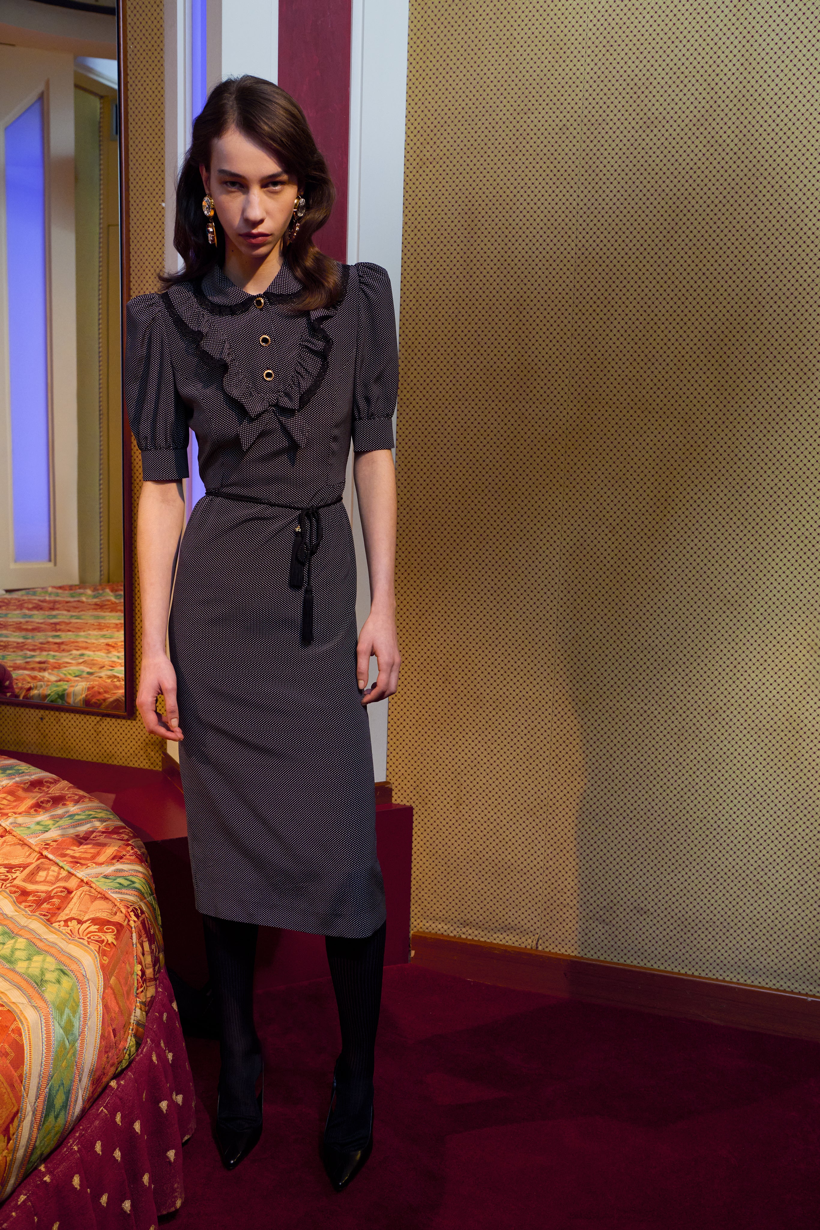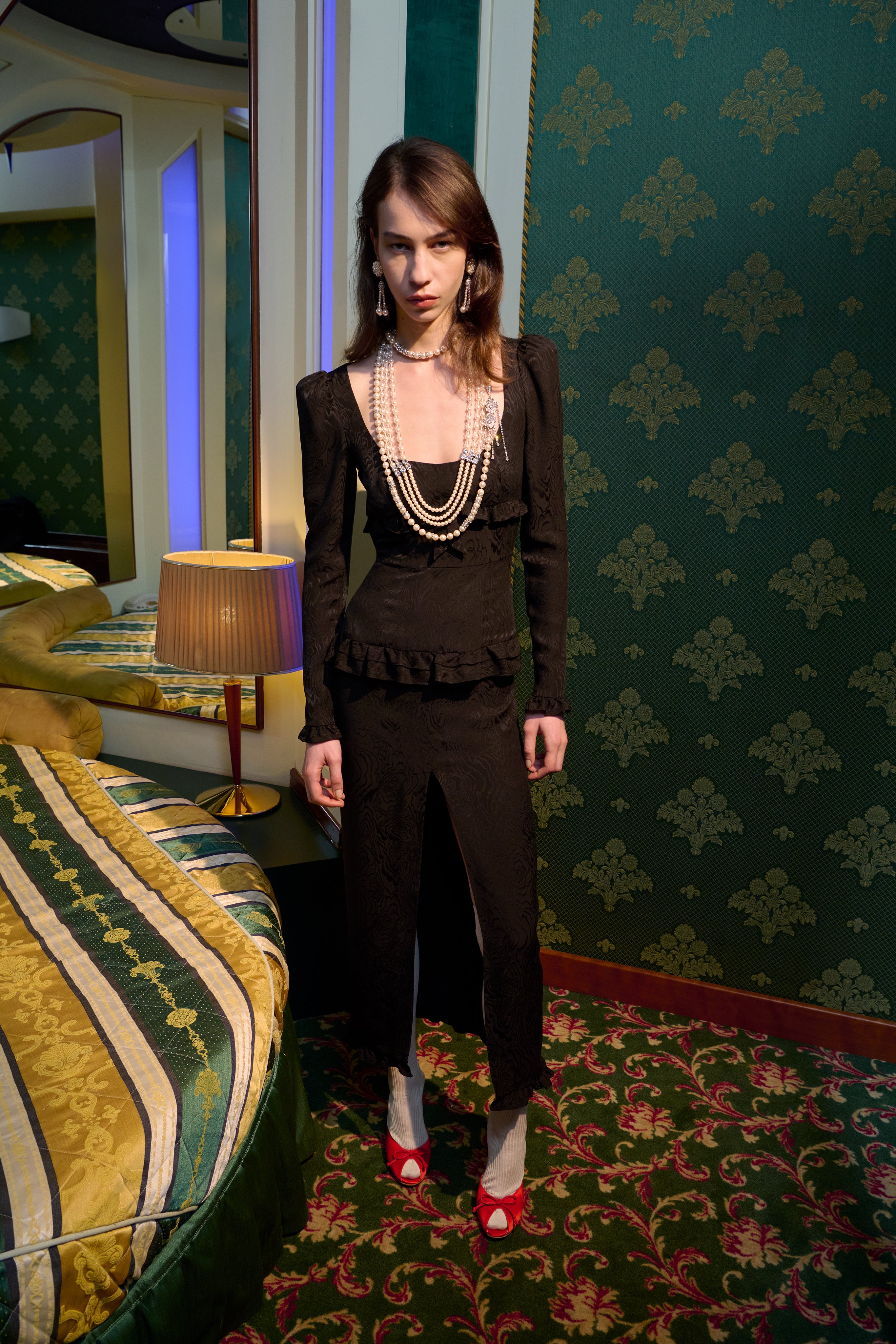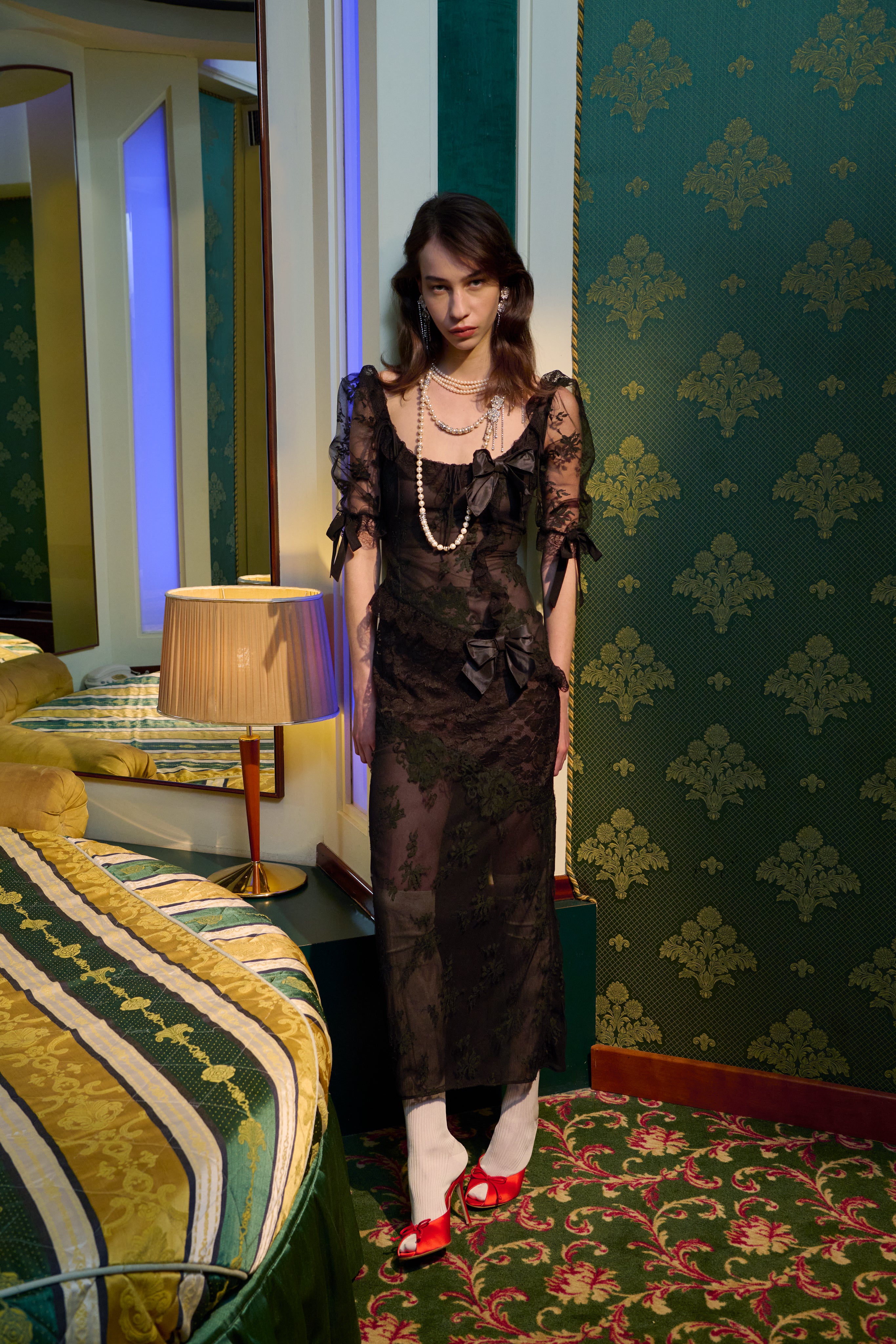 Sitting on the edge of the bed, her back straight, she takes a dark lipstick from the bedside table, applying it without a mirror with the precision of someone who knows every inch of her face by heart.