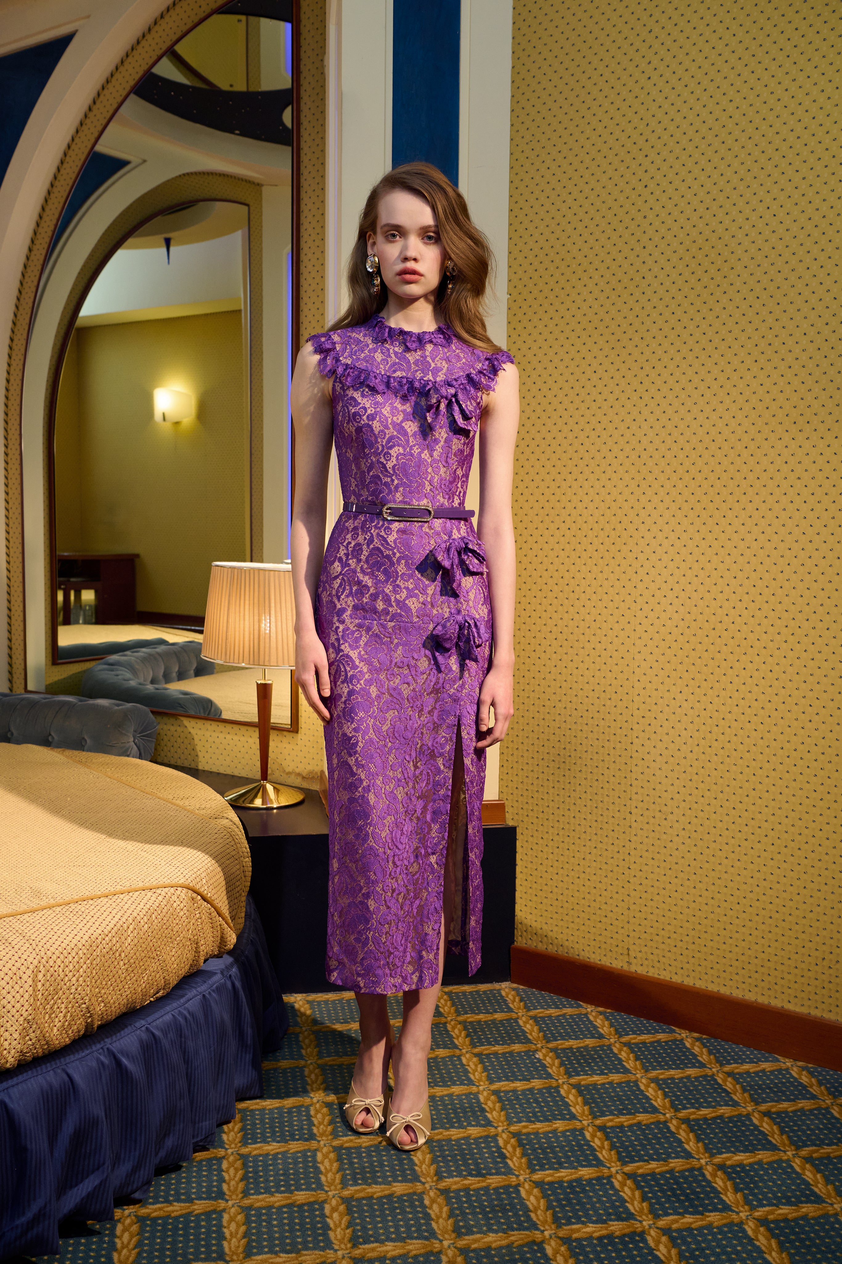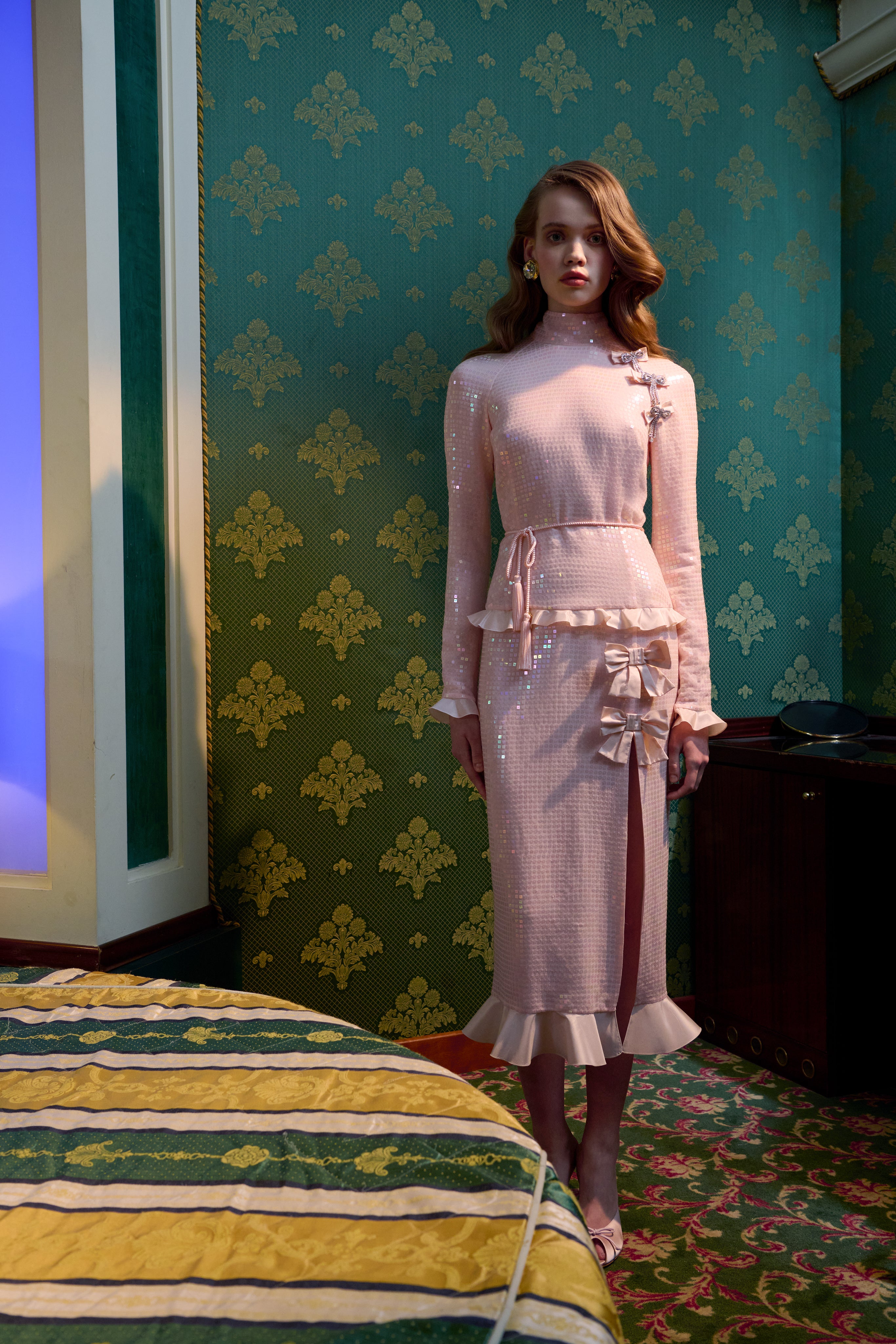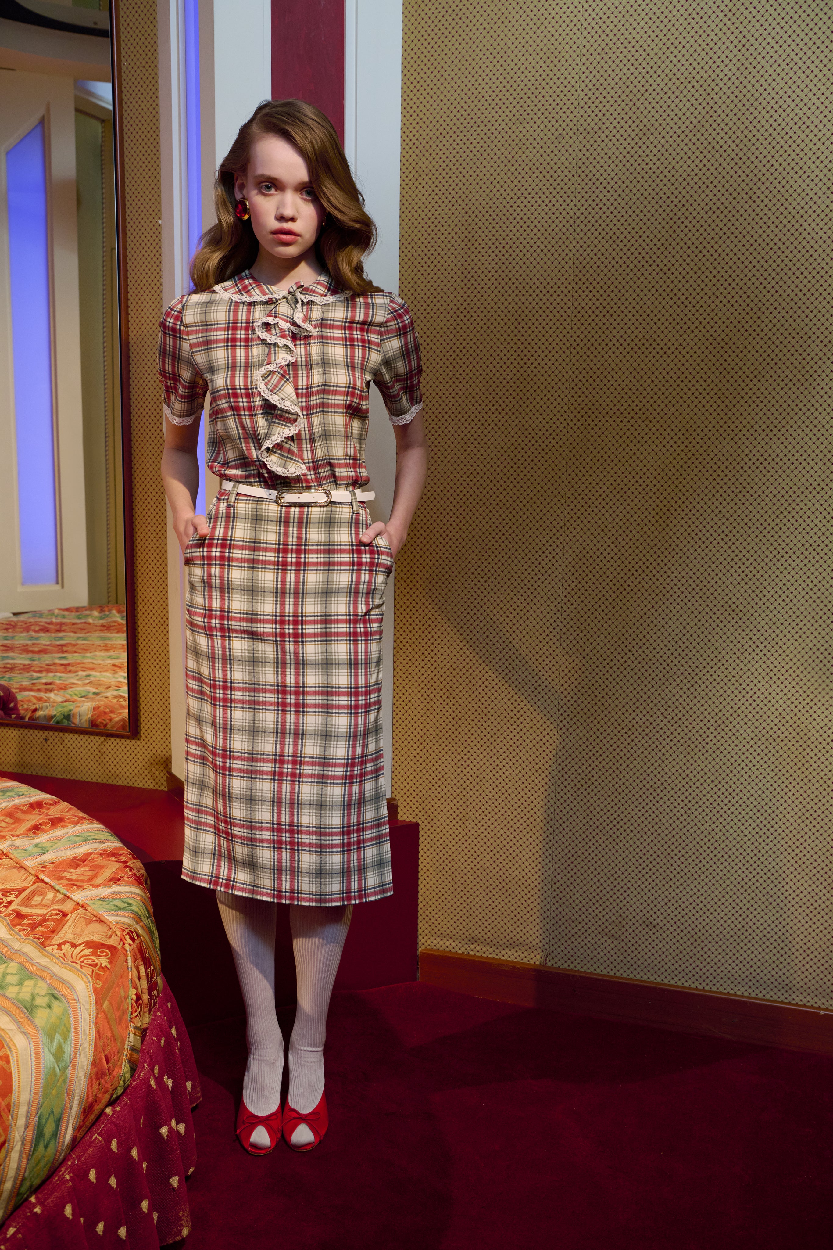 Sitting on the edge of the bed, her back straight, she takes a dark lipstick from the bedside table, applying it without a mirror with the precision of someone who knows every inch of her face by heart.