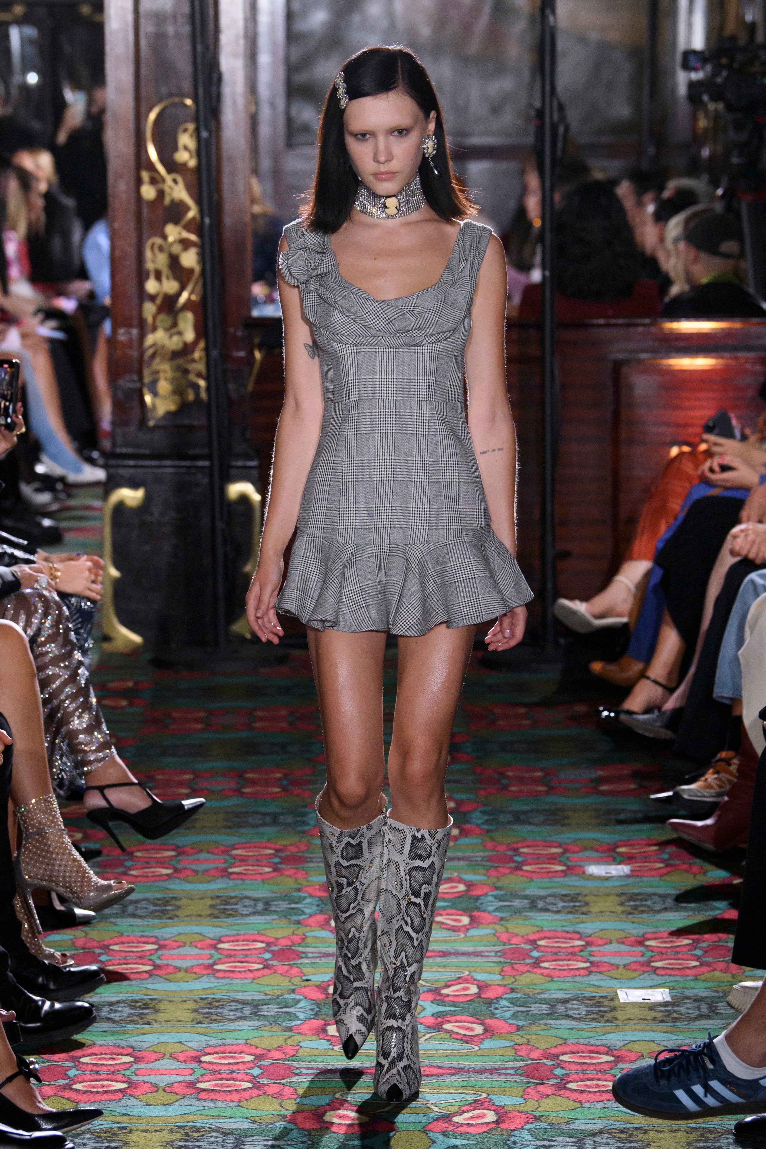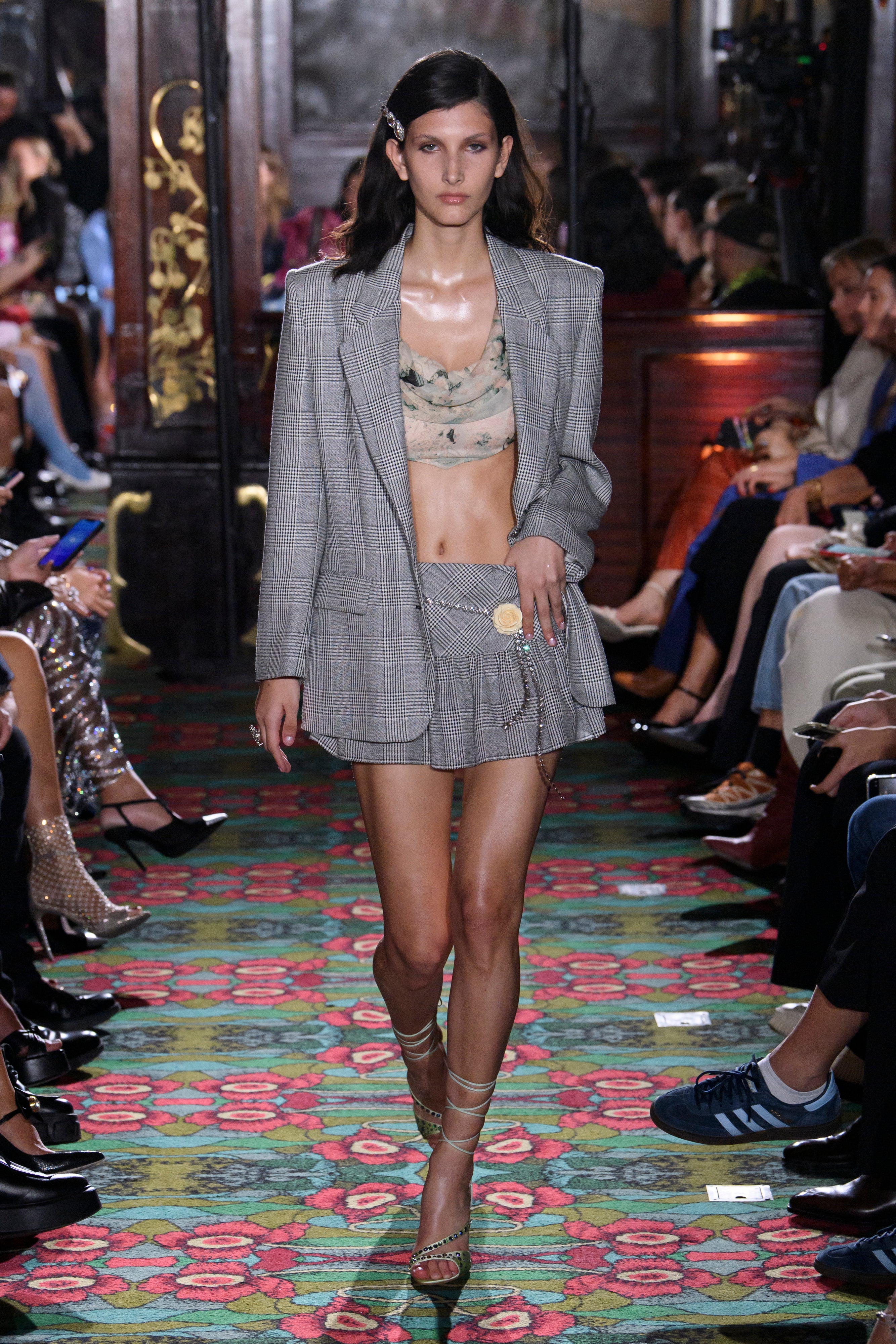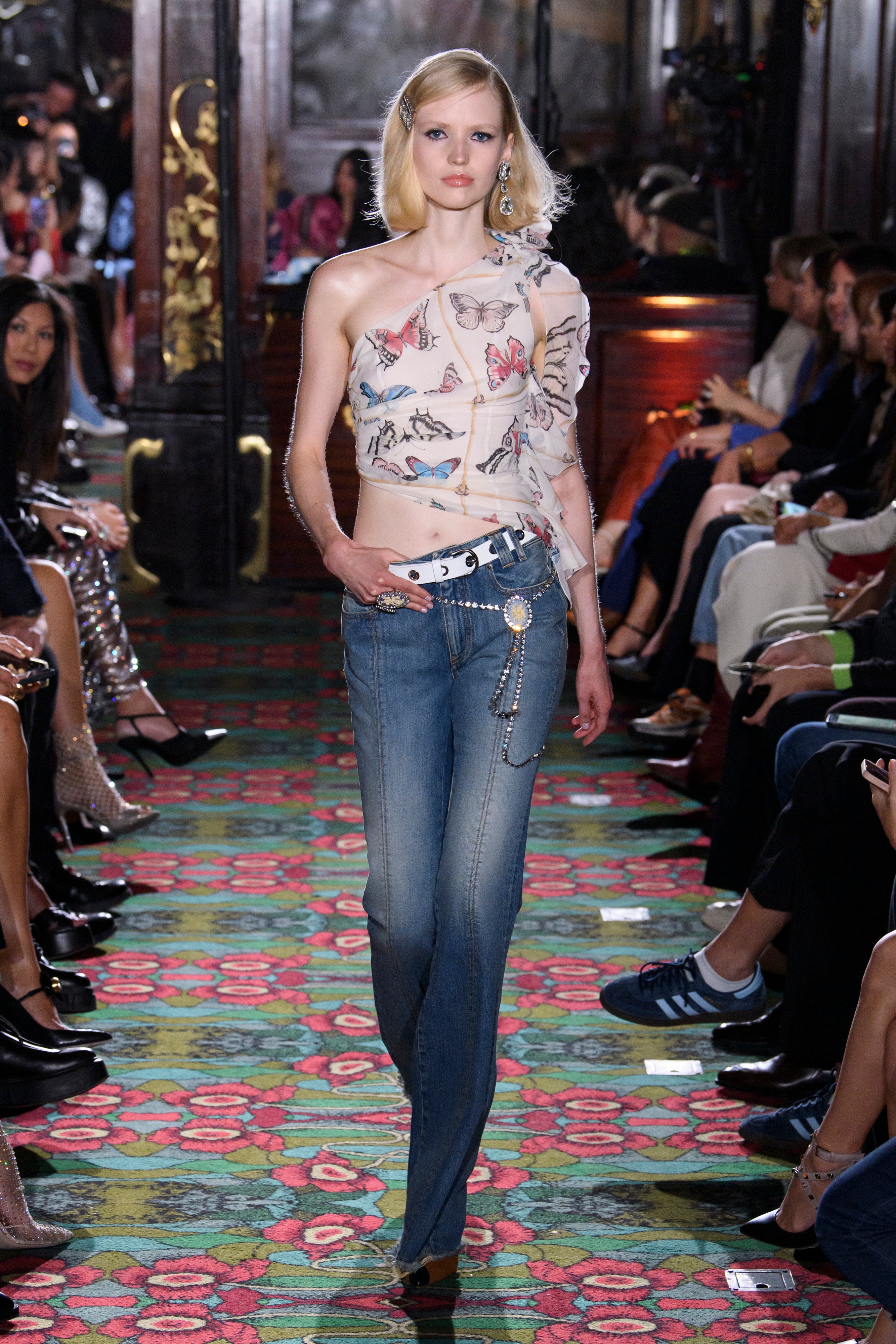 She sits by the window, to be seen and to watch the passing parade, waiting for her champagne, wearing a patchwork of denim and brocade. It’s the perfect moment to admire her parure of cameo jewels and watch her lace up her powder pink sandals.