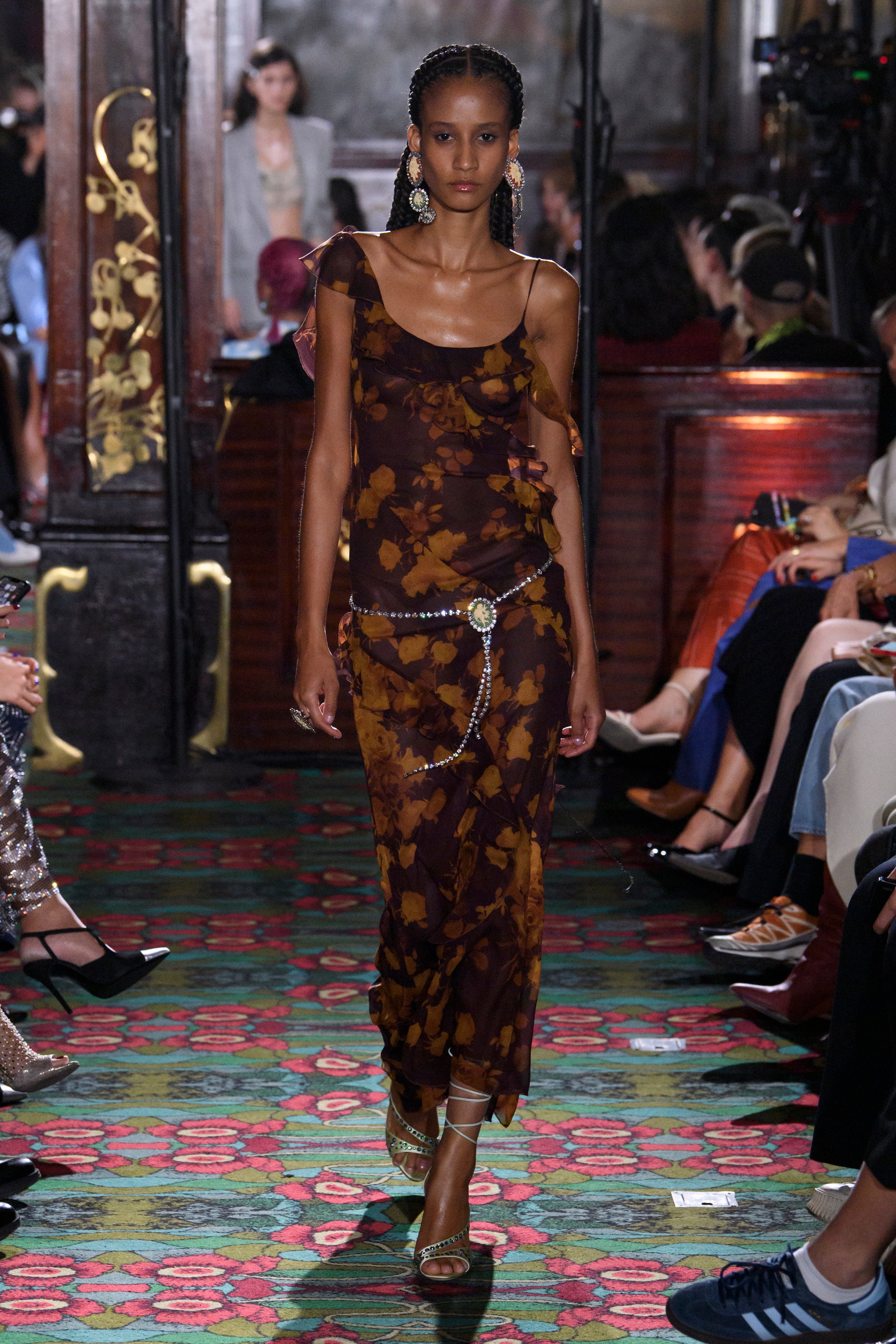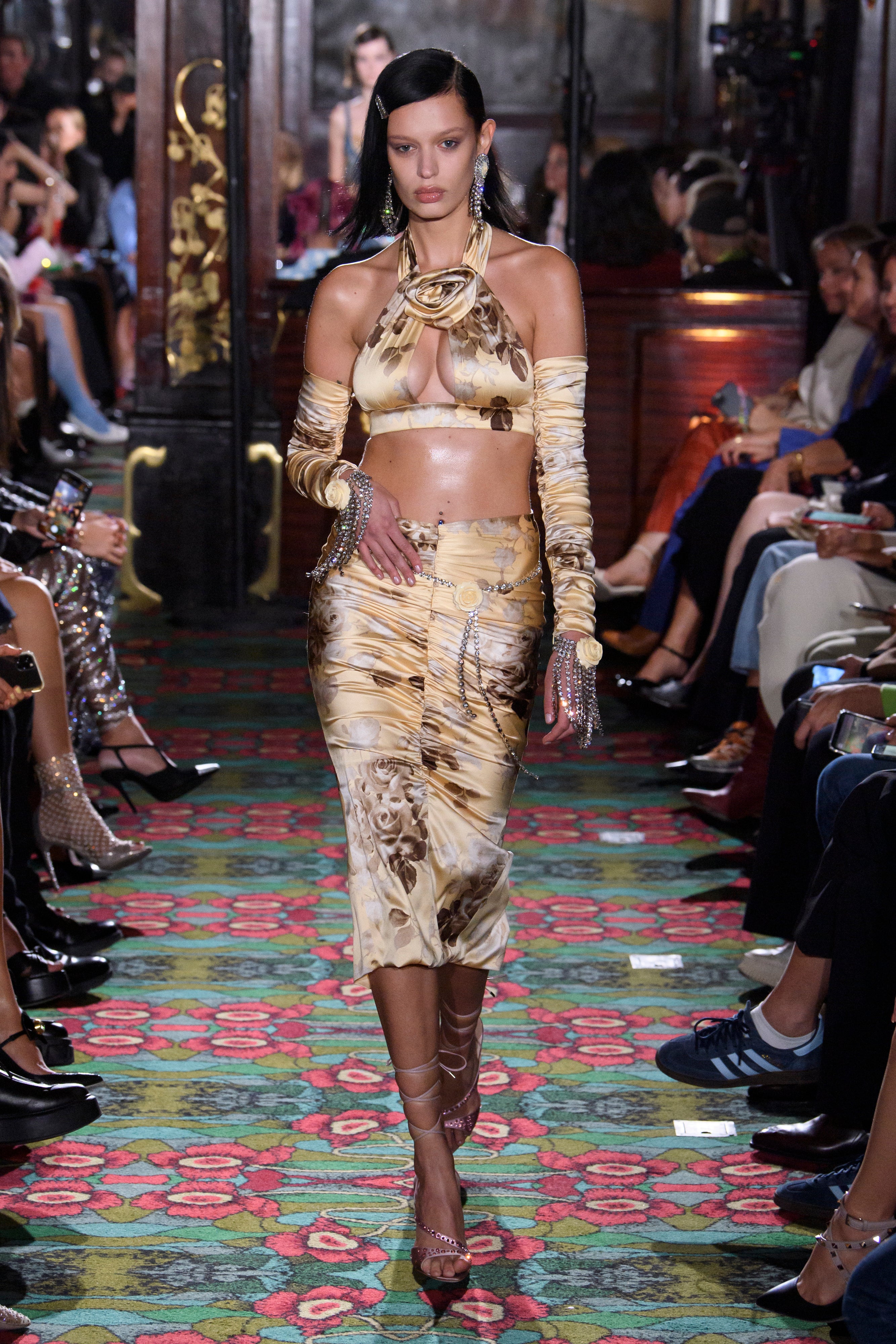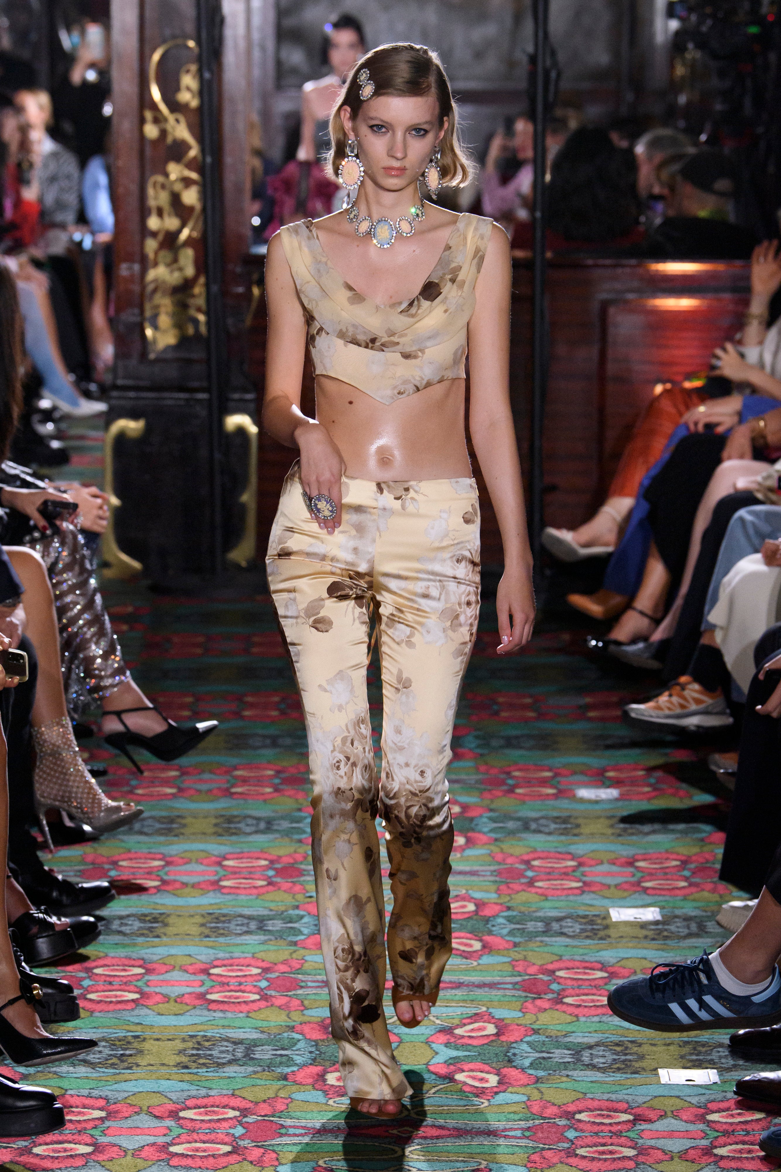 The instant she leaves the city lights behind, tight in a floral printed satin dress, someone opens the door for her. Just a sign in the air with her hand, covered by tulle and crystals. Everybody looks to her lips, lit red, like fresh roses or hot fires, made of seduction. She continues to walk, pouting her lips, in her low-rise silk flares and chiffon cropped top, leaving diamonds as footprints.
