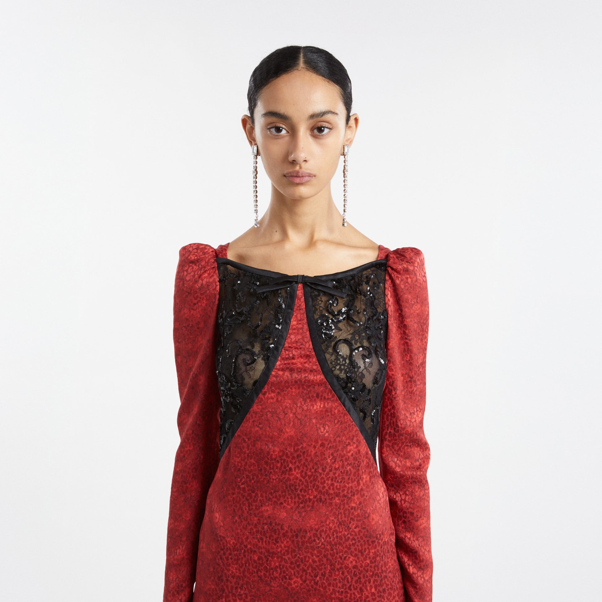 Print silk jacquard evening dress with lace